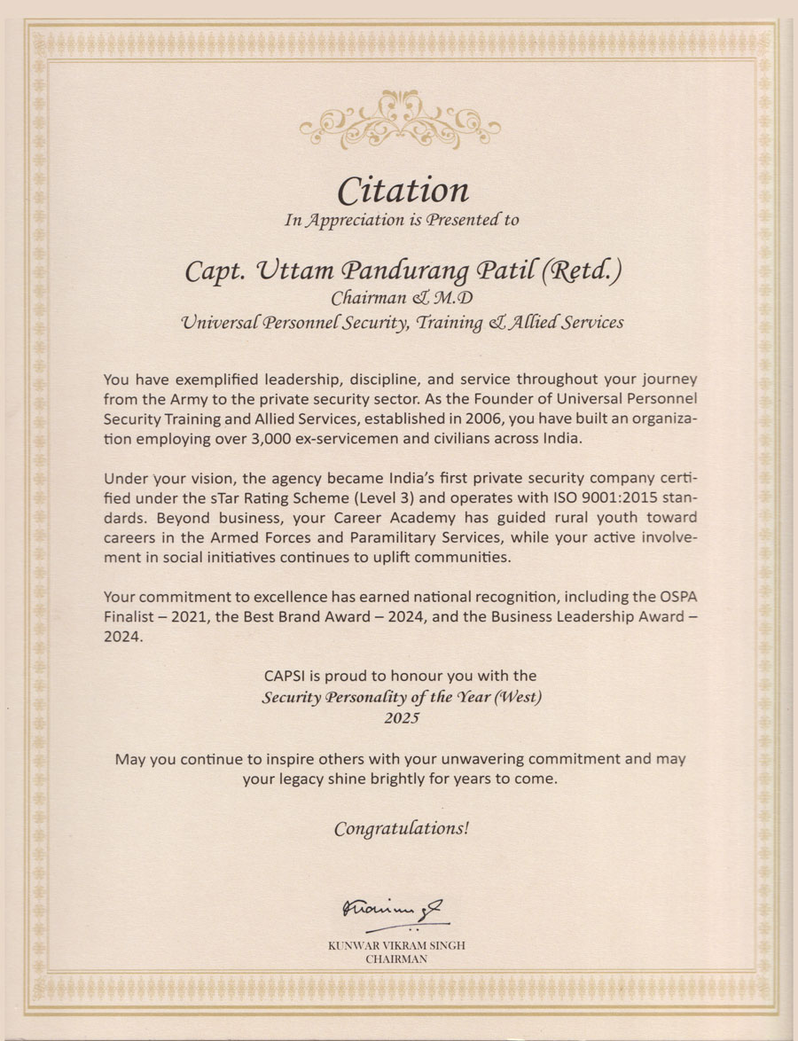 Universal Personnel Security Training & Allied Services is one of the leading Security Services Company in India. Universal Personnel Security Training & Allied Services was founded by Capt Uttam Patil (Retd) and his team on 02 Oct 2006 at Kolhapur, Maharashtra with the objectives of providing gainful employment to ex-servicemen and for providing adequate training to rural youth so as to prepare them for entry into Armed Forces / Police / paramilitary forces and also to train them as security guards. Our training establishment is approved by DG, Home Guards. The company was initially sponsored by DGR, MOD (Army) New Delhi for duration of three years. From then on we have grown from strength to strength.